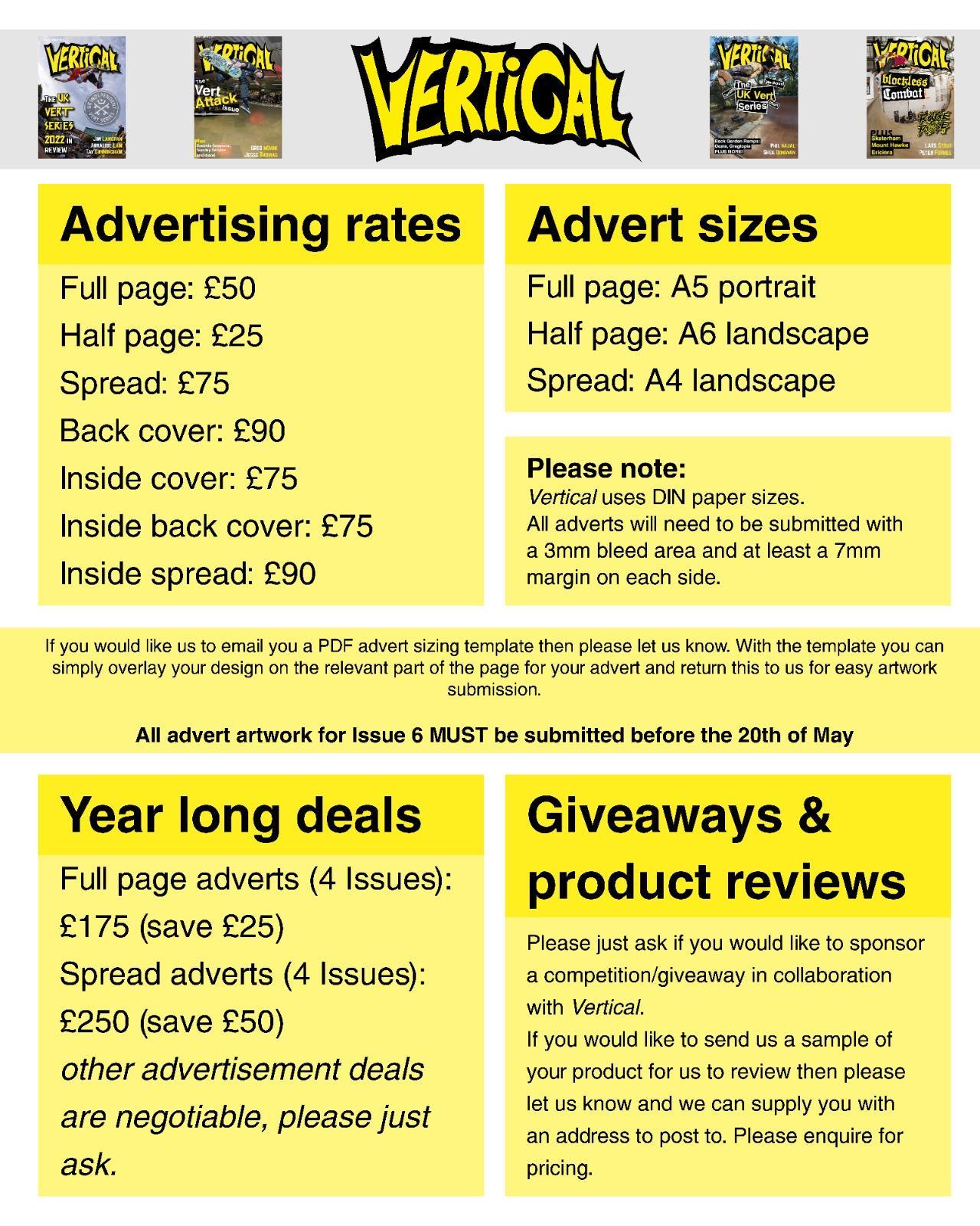 Here at Vertical, we rely on money from advertising in order to break even each issue so that we can survive to bring you the latest from the world of vert skating. I like to think that Vertical offers advertisers the unique opportunity to reach a very elusive niche of vert skaters from across the globe.
